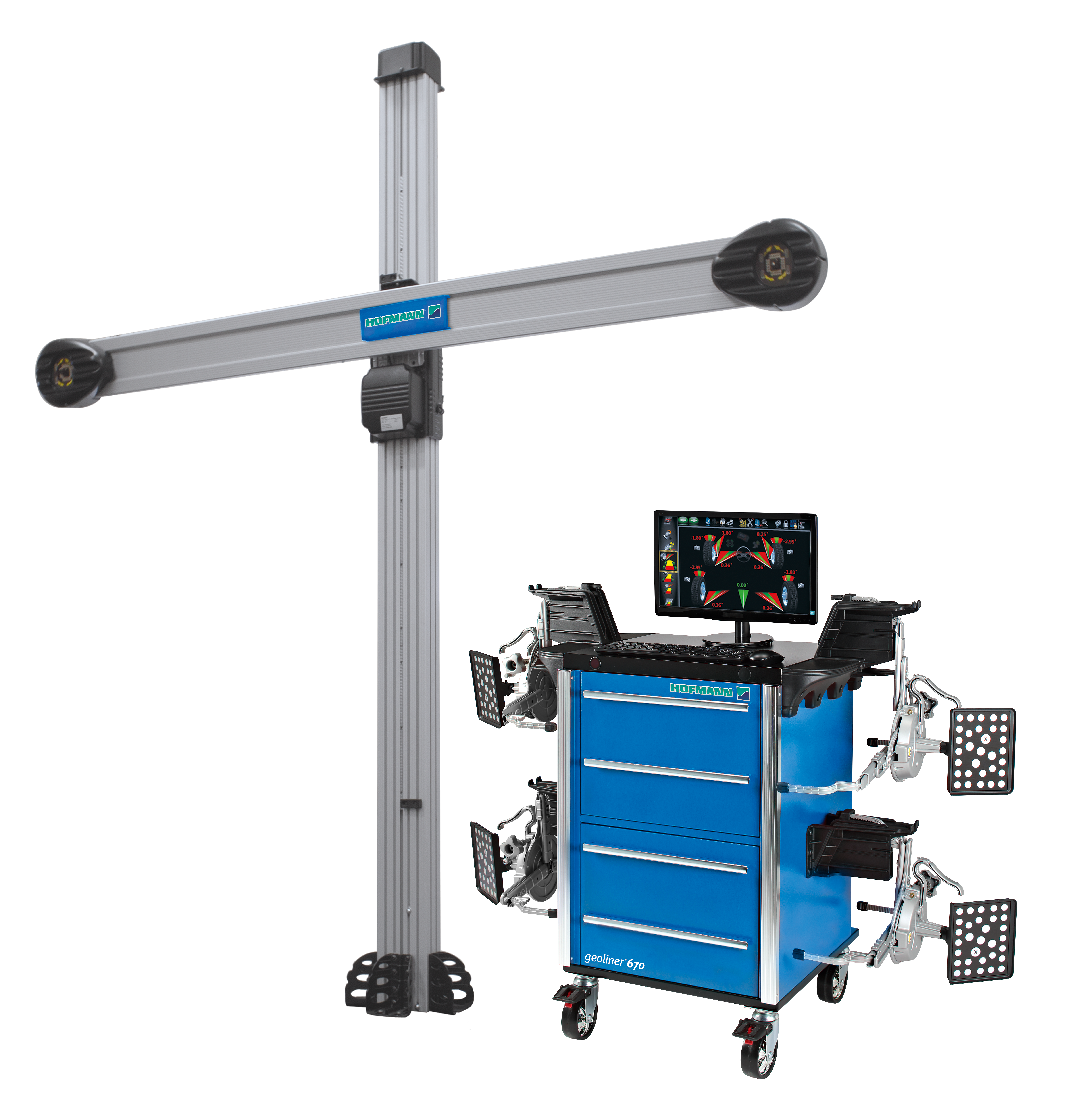 Стенд РУУК с максимальной пропускной способностью, с универсальными колёсными адаптерамии AC100 и подъёмным устройством для балки с камерами; с монитором 24", поворотными площадками премиум, вставками для прокатки, защитным чехлом и дополнительной мишенью TIP.